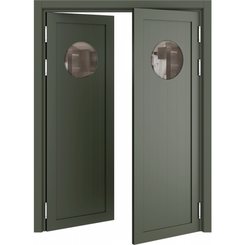 Барные двери актуальны в помещениях с повышенной проходимостью для более удобного доступа персонала к техническим комнатам, например с бара в зону кухни. Часто бывает необходимым, для обзора соседнего помещения, чтобы дверь была остекленная и стилистически оформлена. Стекло толщиной 4 мм круглой, овальной или квадратной формы, на выбор: сатинат светлый, бронзовый, графит или прозрачное стекло. Устанавливается на двери толщиной 40 мм в покрытии Эмаль (любой цвет по каталогу RAL Classic K7) и толщиной 35 мм в ПВХ-покрытиях.